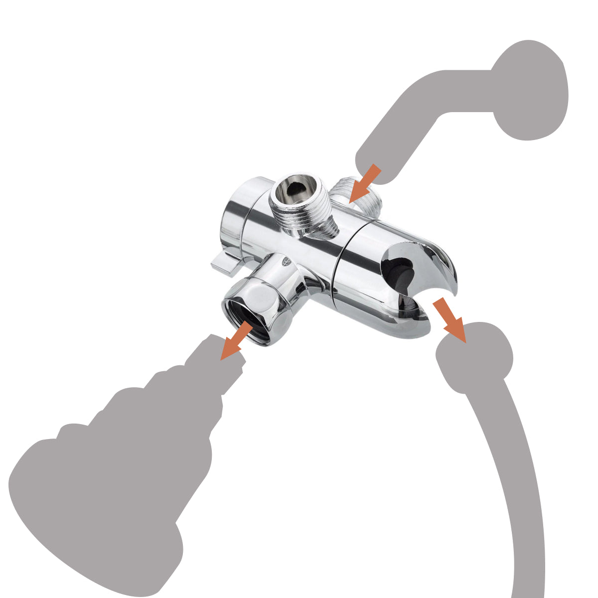 The 3-way diverter allows you to connect two shower devices to one water source and easily switch between them or use both simultaneously.